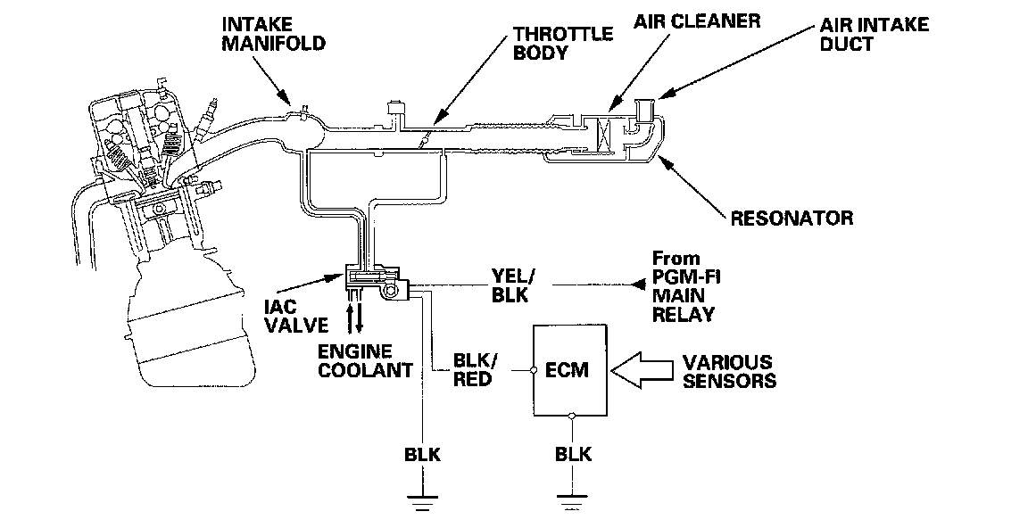 When the engine is cold, the A/C compressor is on, the transmission is in gear, the brake pedal is pressed, the P/S load is high, or the alternator is charging, the ECM controls current to the IAC valve to maintain the correct idle speed.