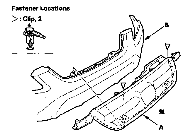 2. Remove the clips, and remove the front grille (A) from the front bumper (B) by pulling it out. Take care not to scratch the front bumper.