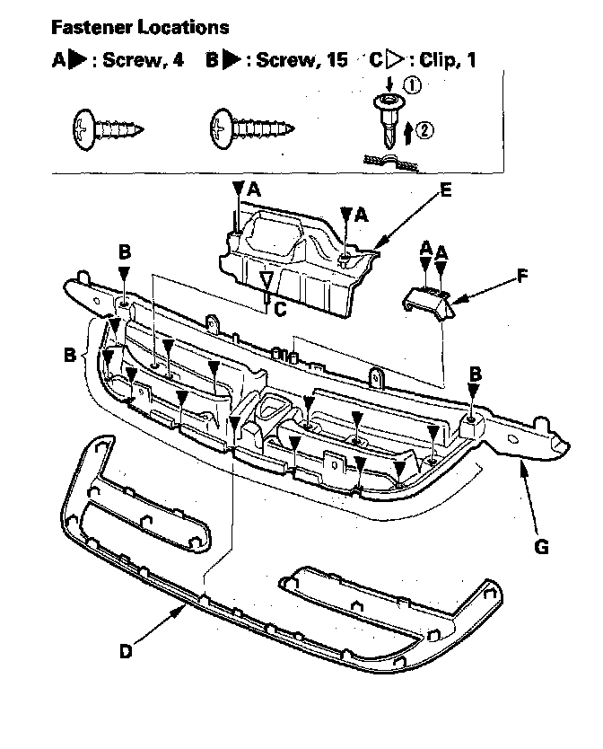 3. If necessary, remove the screws (A, B) and clip (C), then remove the grille molding (D), splash shield (E), and front grille absorber (F) from the front grille (G).