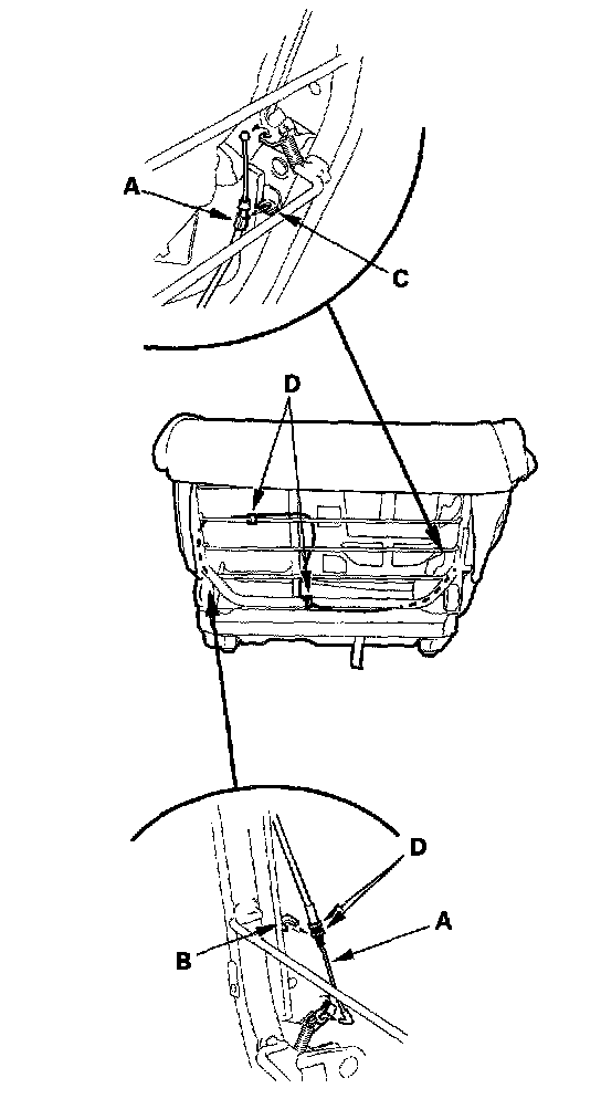 7. Disconnect the seat-back lock control cable (A) from the inner recline adjuster (B) and the outer recline adjuster (C). Release the clamps (D), then remove the cable.