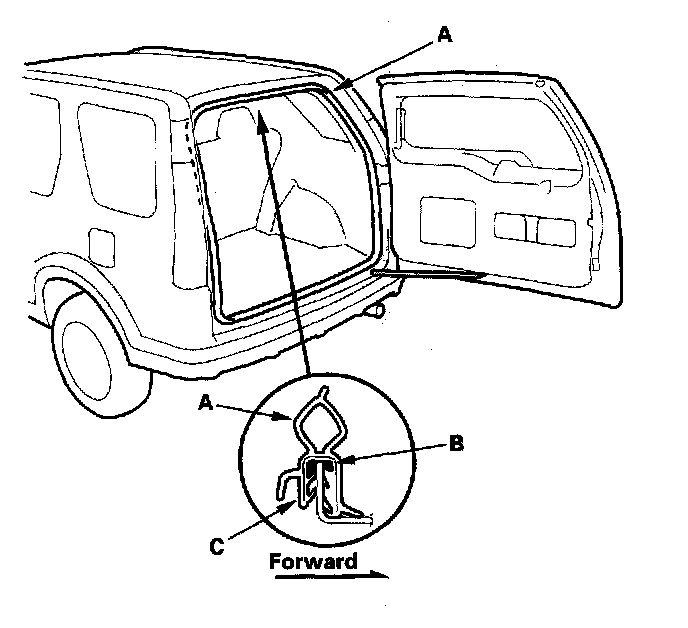 4. Locate the painted alignment mark (C) on the tailgate weatherstrip. Align the painted mark with the alignment tab in the center of the tailgate opening, and install the weatherstrip. Make sure it's seated completely and facing in the direction shown. Make sure there are no wrinkles in the weatherstrip.