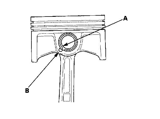 2. Apply engine oil to the piston pin snap rings (A), and turn them in the ring grooves until the end gaps are lined up with the cutouts in the piston pin bores (B).