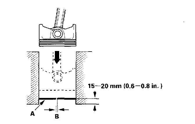 4. Using a piston, push a new ring (A) into the cylinder bore 15 - 20 mm (0.6 - 0.8 inch) from the bottom.