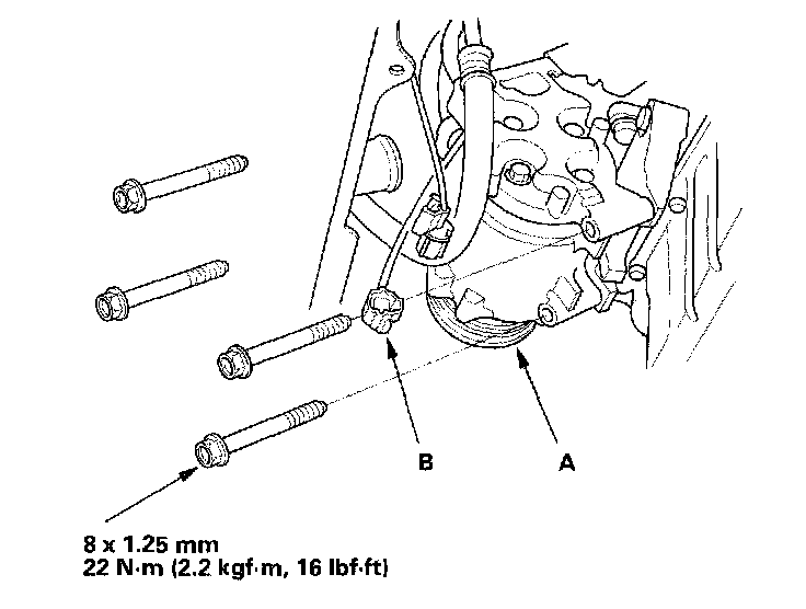 3. Install the A/C compressor (A), and connect the compressor clutch connector (B).