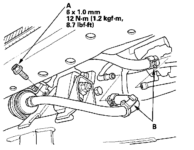 22. Tighten the Automatic Transmission Fluid (ATF) filter mounting bolt (A), and install the ATF cooler hoses (B) (A/T).