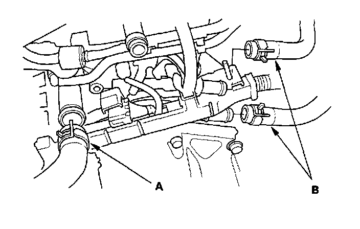25. Install the upper radiator hose (A) and heater hoses (B).
