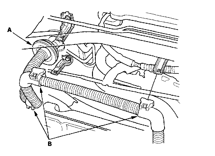 33. Install the brake booster vacuum hose (A) and the evaporative emission (EVAP) canister hose (B).