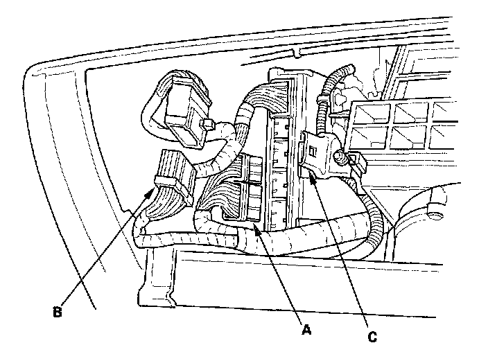 32. Connect the ECM/PCM connectors (A) and main wire harness connector (B). Attach the main wire harness connector to the connector holder (C).