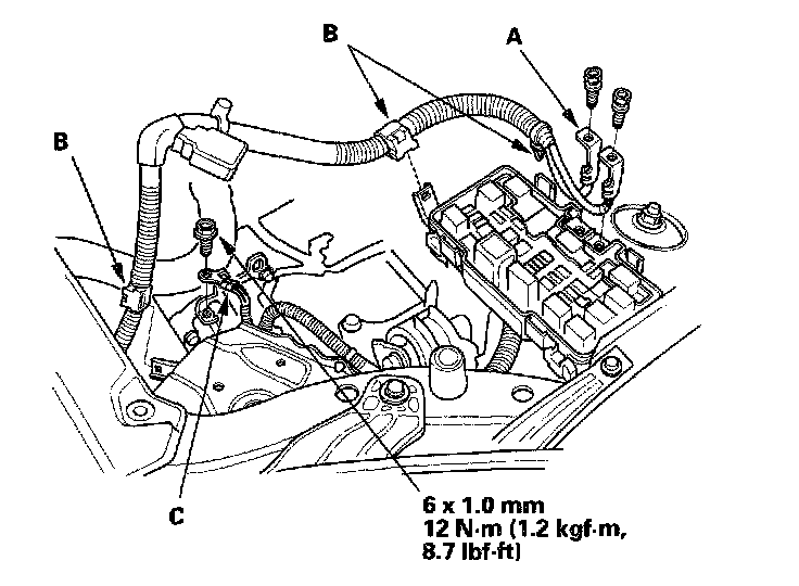 37. Install the battery cables (A) on the under-hood fuse/relay box, then install the harness clamps (B).