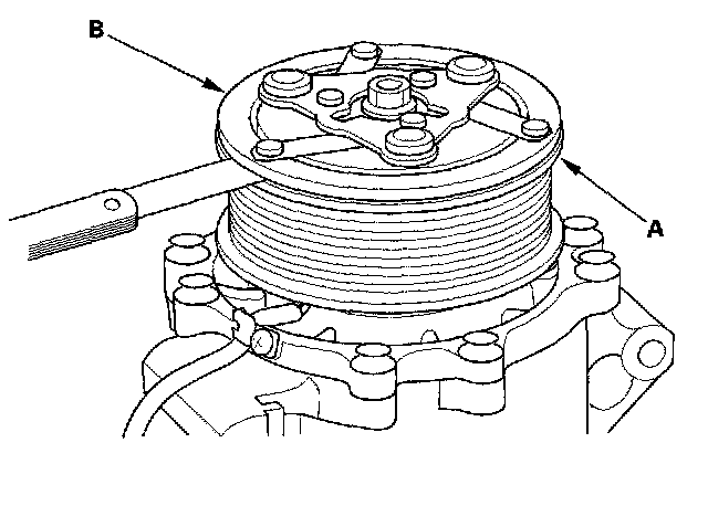 3. Measure the clearance between the rotor pulley (A) and the armature plate (B) all the way around. If the clearance is not within specified limits, remove the armature plate and add or remove shims as needed to increase or decrease clearance.