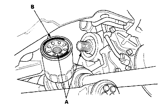 2. Inspect the threads (A) and the rubber seal (B) on the new filter. Wipe off the seat on the engine block, then apply a light coat of oil to the filter rubber seal. Use only filters with a built-in bypass system.