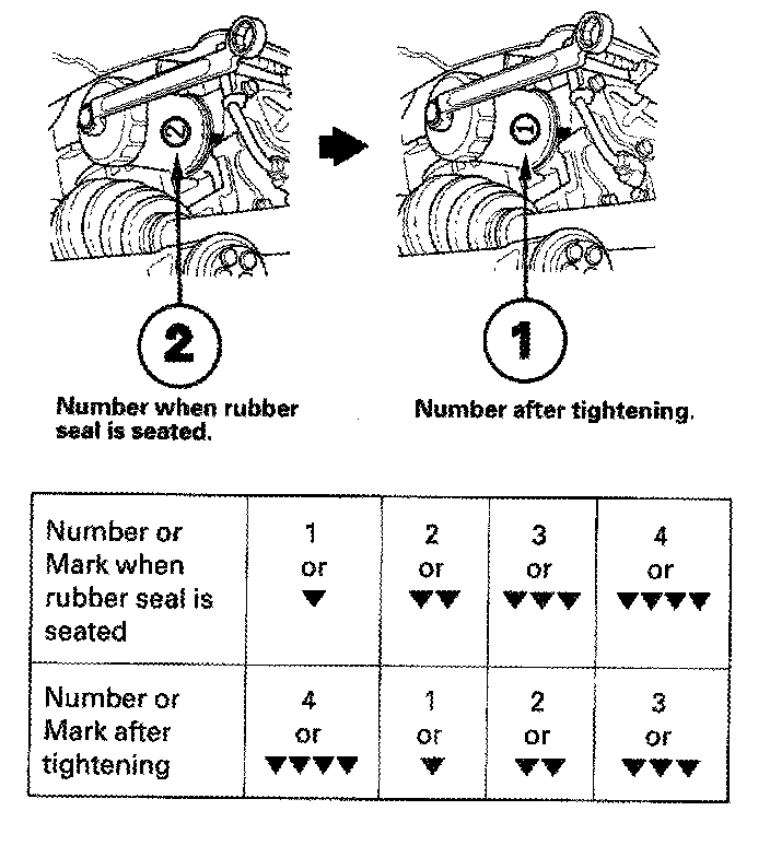 - Tighten the filter by turning it clockwise 3 numbers or marks from the one you noted. For example, if the number 2 is at the bottom when the seal is seated, tighten the filter until the number 1 comes around the bottom.
