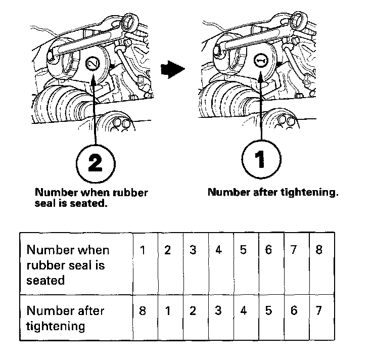 - Tighten the filter by turning it clockwise 7 numbers from the one you noted. For example, if number 2 is at the bottom when the seal is seated, tighten the filter until the number 1 comes around the bottom.