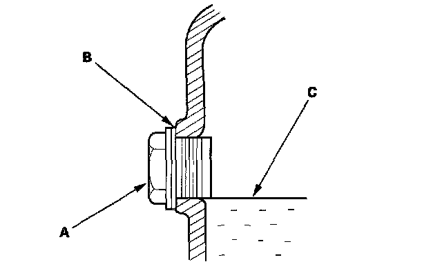2. Remove the oil filler plug (A) and washer (B), check the condition of the fluid, and make sure the fluid is at the proper level (C).