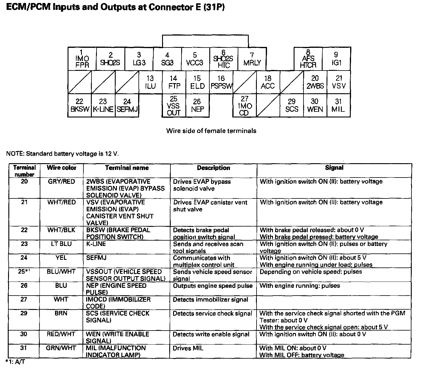 ECM/PCM Inputs and Outputs at Connector E (31P):
