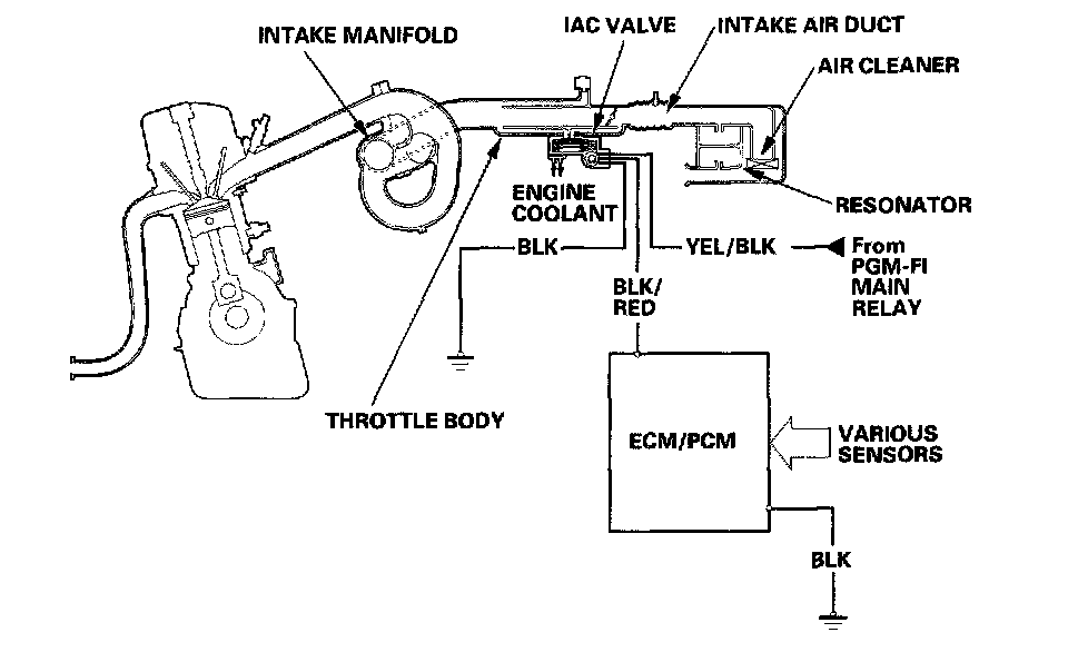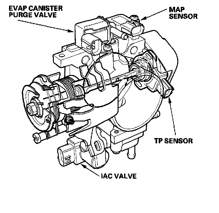 The throttle body is a single-barrel side draft type. The lower portion of the idle air control (IAC) valve is heated by engine coolant from the cylinder head.