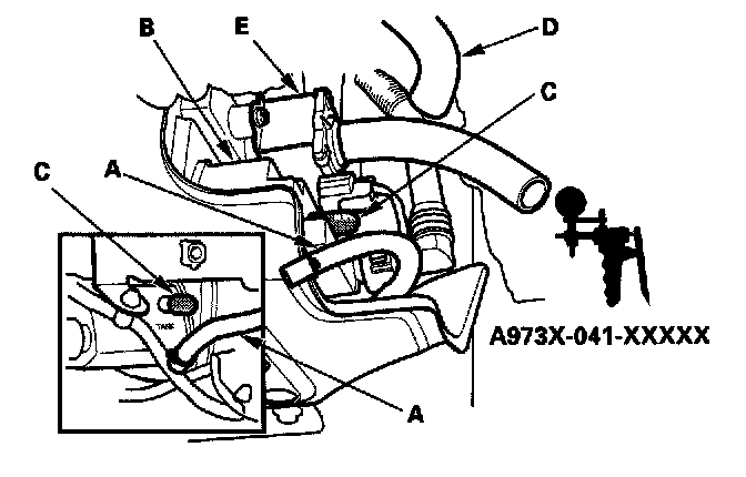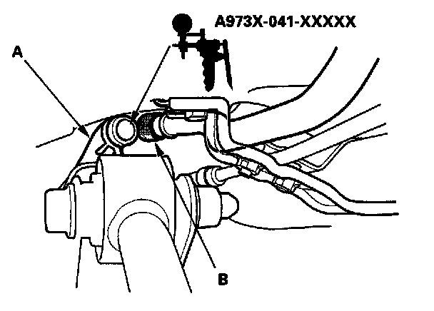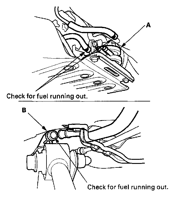 9. Fill the fuel tank with fuel, then check for fuel in the EVAP two way valve (A), and fuel tank vapor recirculation hose (B).