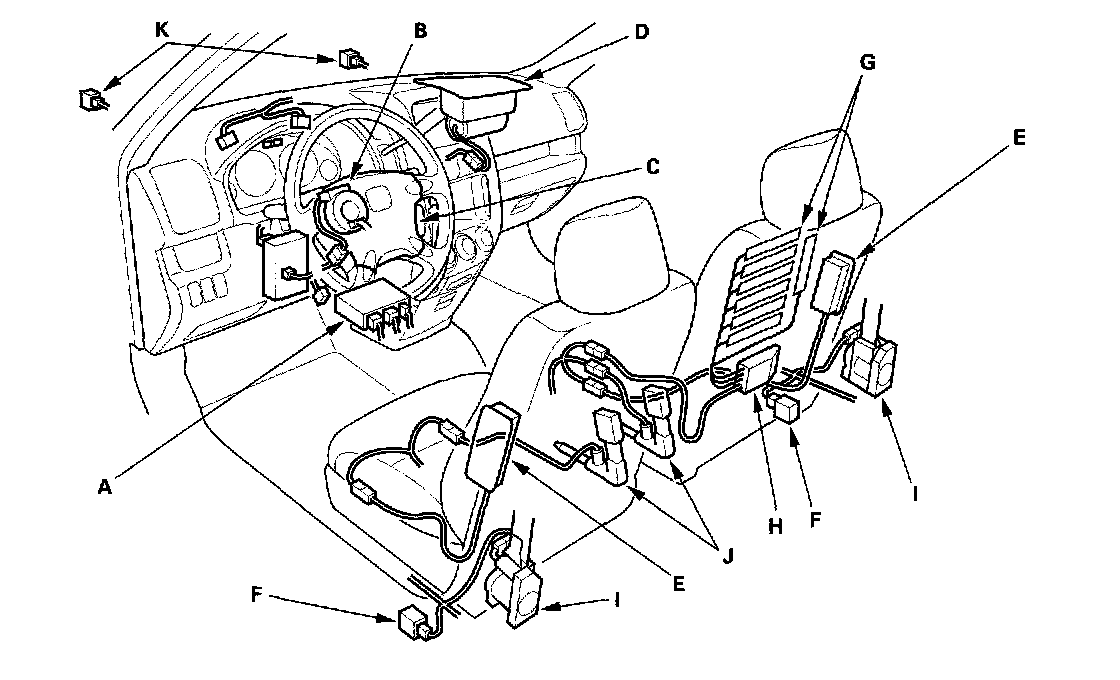 The SRS is a safety device which, when used with the seat belt, is designed to help protect the driver and front passenger in a frontal impact exceeding a certain set limit. The system consists of the SRS unit, including safing sensor and impact sensor (A), the cable reel (B), the driver's airbag (C), the front passenger's airbag (D), side airbags (E), seat belt tensioners (I), seat belt buckle tensioners (J), and front impact sensors (K).