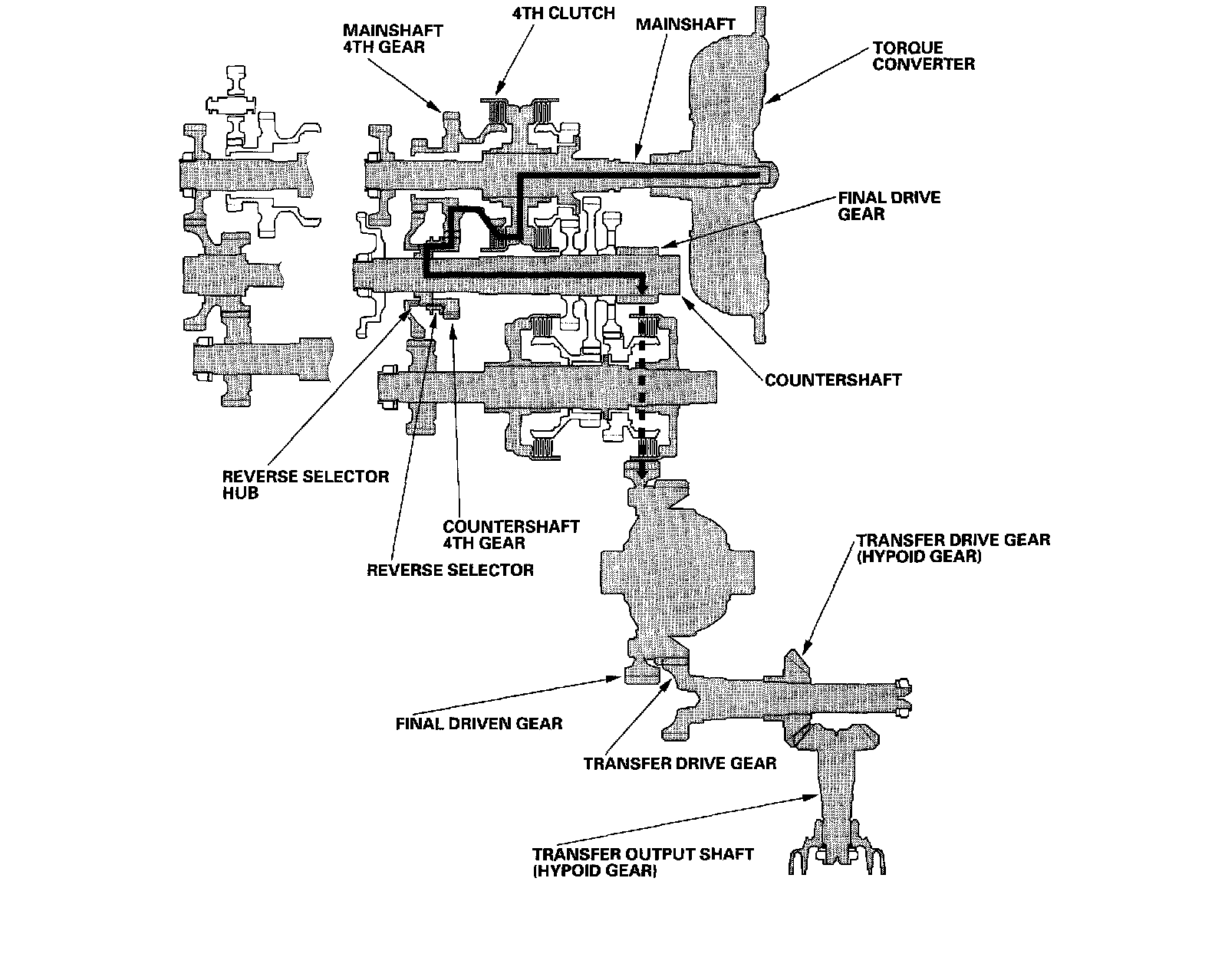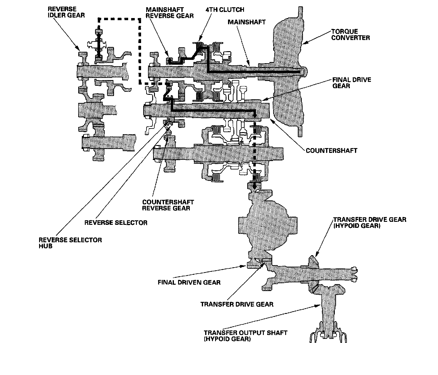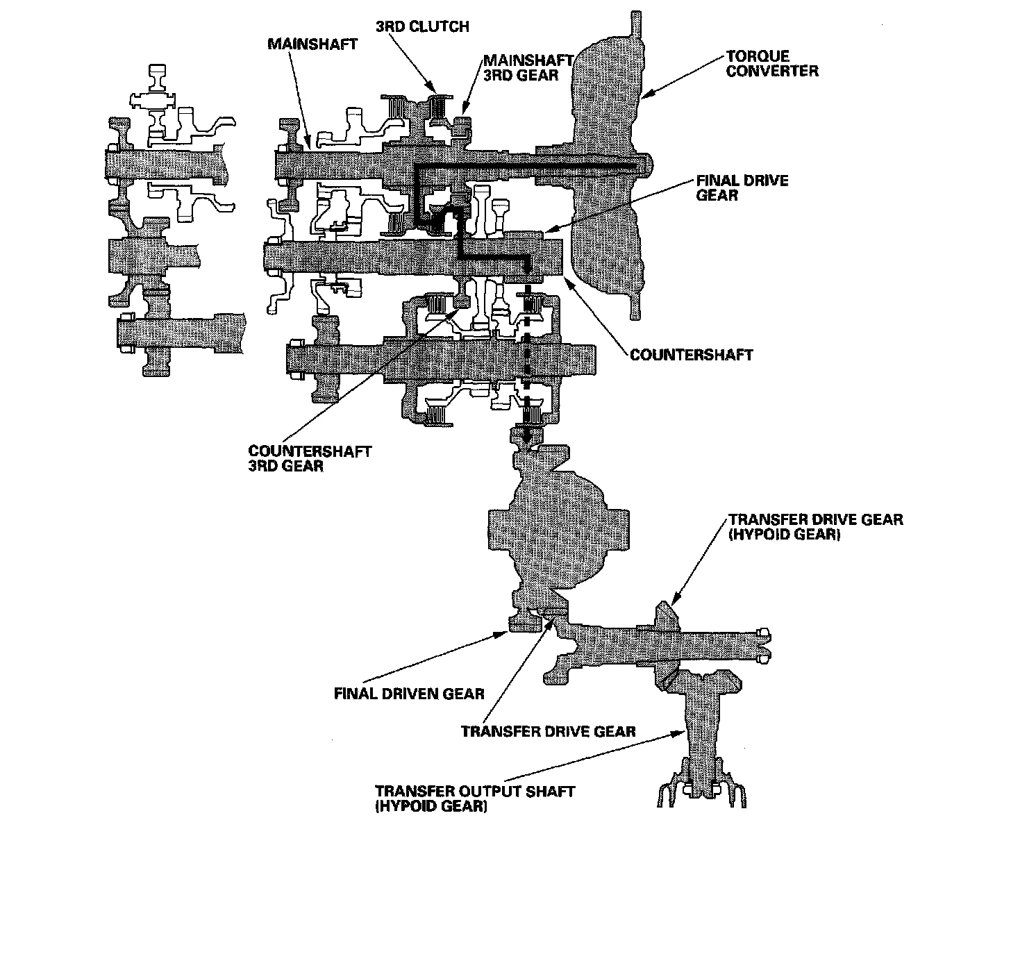 Engine power transmitted from the torque converter drives the mainshaft idler gear, the idler shaft idler gear, and the secondary shaft idler gear, but hydraulic pressure is not applied to the clutches. Power is not transmitted to the countershaft.