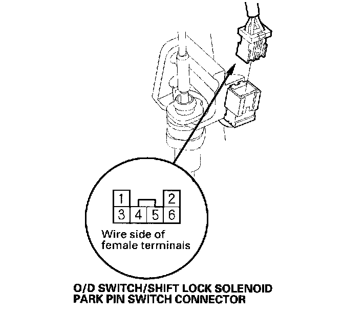 3. Check for continuity between the No. 5 and No. 6 terminals of the O/D switch/shift lock solenoid/park pin switch connector while pushing the O/D switch, and when the switch is released.