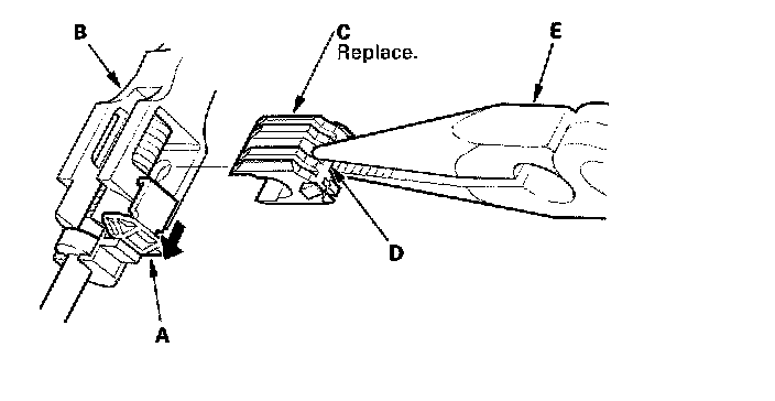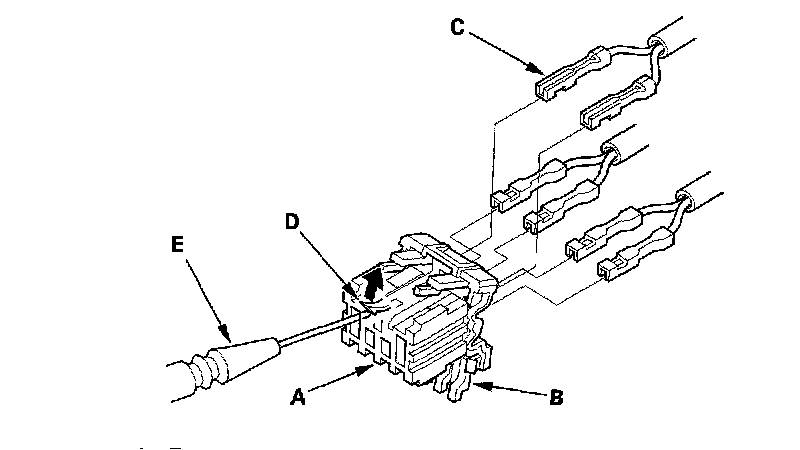 13. Remove the terminal (C) from the connector by pushing the lock tab (D) up in the connector using a thin blade screwdriver (E). Remove all six terminals.