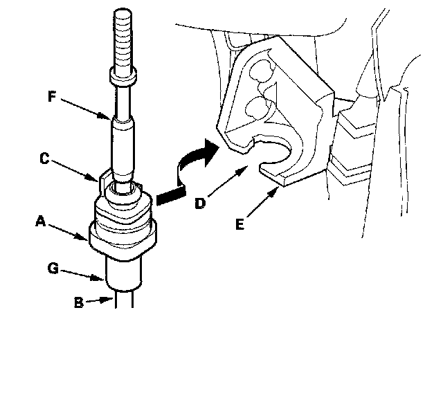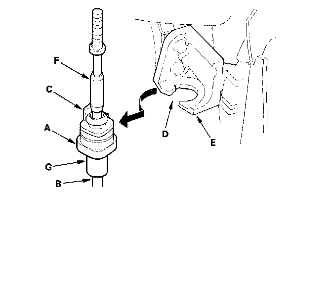 32. Rotate the socket holder (A) on the shift cable (B) to place the tab (C) on the holder opposite of the opening (D) in the socket holder bracket (E). Align the holder with the opening in the bracket, then slide the holder into the bracket. Rotate the holder a quarter turn to secure the shift cable. Do not install the shift cable by twisting the shift cable guide (F) and damper (G).