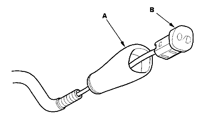 16. Pull the O/D switch harness wires (A) from shift lever bracket side, and remove them. Leave the harness tube (B) and remove only the wires.