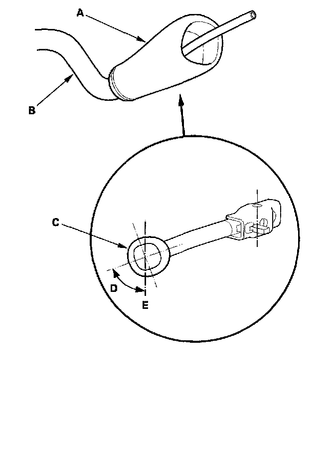 9. Rotate the socket holder (A) on the shift cable (B) a quarter turn; the tab (C) on the socket holder will be in the opening (D) of the socket holder bracket (E). Then slide the holder to remove the shift cable from the socket holder bracket.
