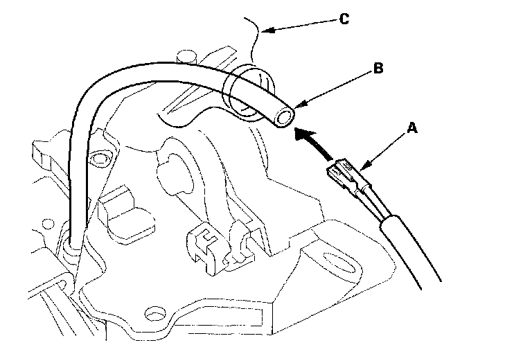 18. Insert the new O/D switch harness wires (A) in the original harness tube (B), then tie a string (C) around the tube to secure the terminals in the tube.