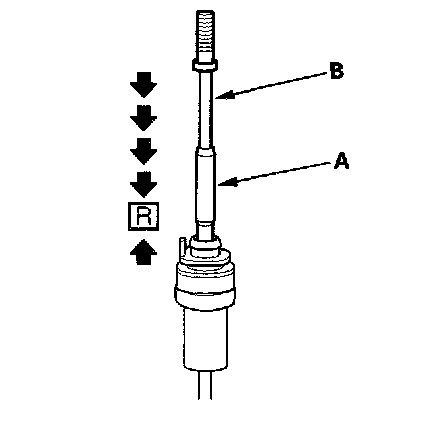 29. If necessary, push the shift cable until it stops, then release it. Pull the shift cable back one step so that the shift cable is in R. Do not hold the shift cable guide (A) to adjust the shift cable (B).