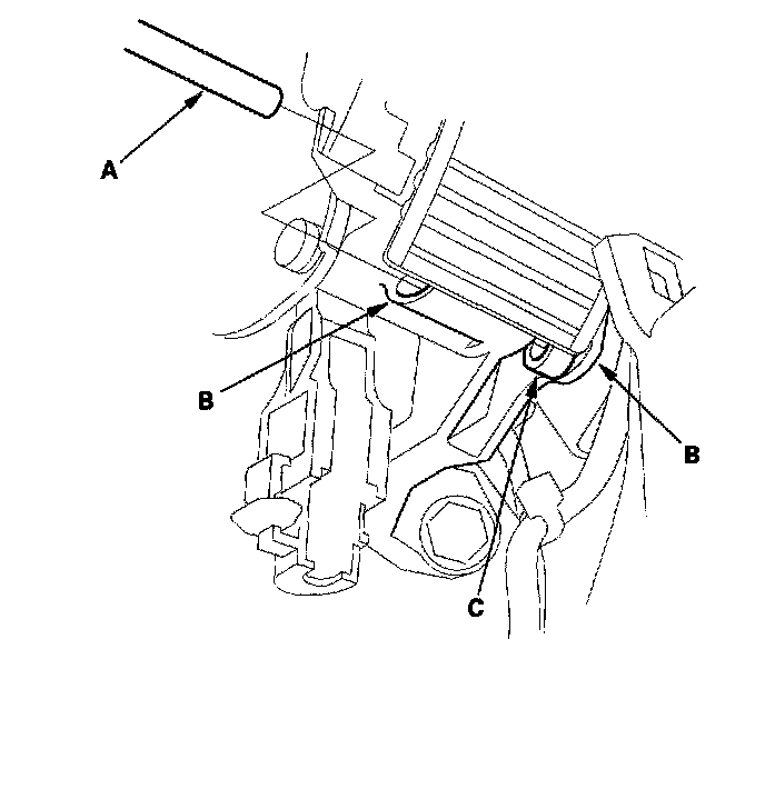 31. Insert a 6.0 mm (0.24 inch) pin (A) into the positioning holes (B) on the shift lever bracket base and through the positioning hole (C) on the shift lever. The shift lever must be in the R position.