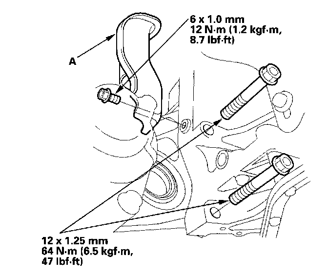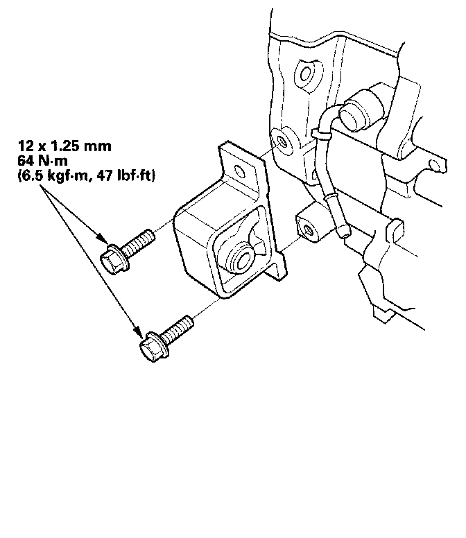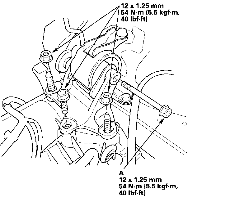11. Install the upper transmission mount bracket. Tighten the mount bolt (A) loosely, and tighten the transmission mount bracket bolt and nuts to the specified torque, then tighten the mount bolt to the specified torque.
