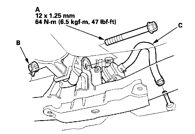 23. Install the front mount bolt (A) and nut (B), connect the ATF cooler hose (C) to the ATF cooler line, then secure the hose with the clip.