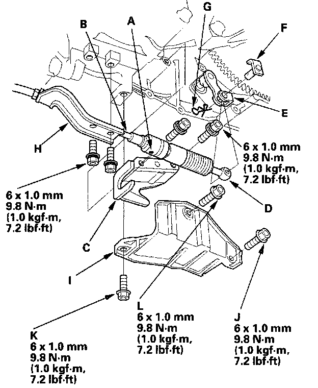 4. Secure the shift cable bracket (H) with the bolts, and install the shift cable cover (I), but do not tighten the bolts.