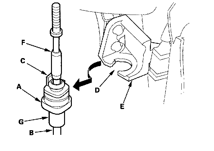 28. Rotate the socket holder (A) on the shift cable (B) to face the tab (C) on the holder opposite to the opening (D) in the socket holder bracket (E). Align the holder with the opening in the bracket, then slide the holder into the bracket. Rotate the holder a quarter turn to secure the shift cable. Do not install the shift cable by twisting the shift cable guide (F) and damper (G).