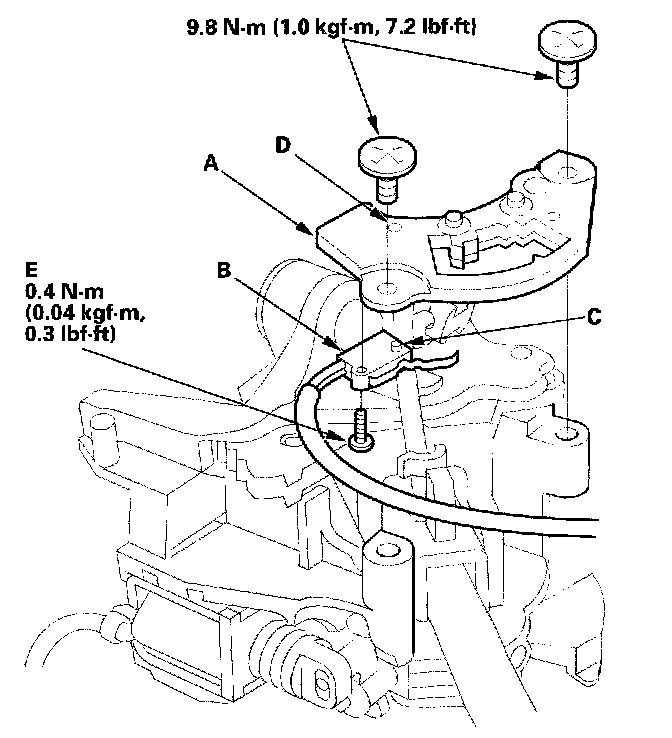 8. Rotate the socket holder (A) on the shift cable (B) a quarter turn; the tab (C) on the socket holder will be in the opening (D) of the socket holder bracket (E). Then slide the holder to remove the shift cable from the socket holder bracket.