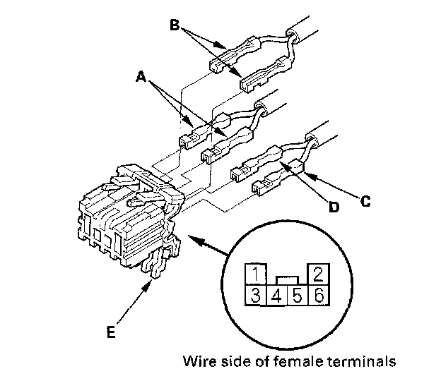 12. Remove the terminal (C) from the connector by pushing the lock tab (D) up in the connector using a thin blade screwdriver (E). Remove all six terminals.
