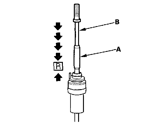 25. If necessary, push the shift cable until it stops, then release it. Pull the shift cable back one step so that the shift cable is in R. Do not hold the shift cable guide (A) to adjust the shift cable (B).