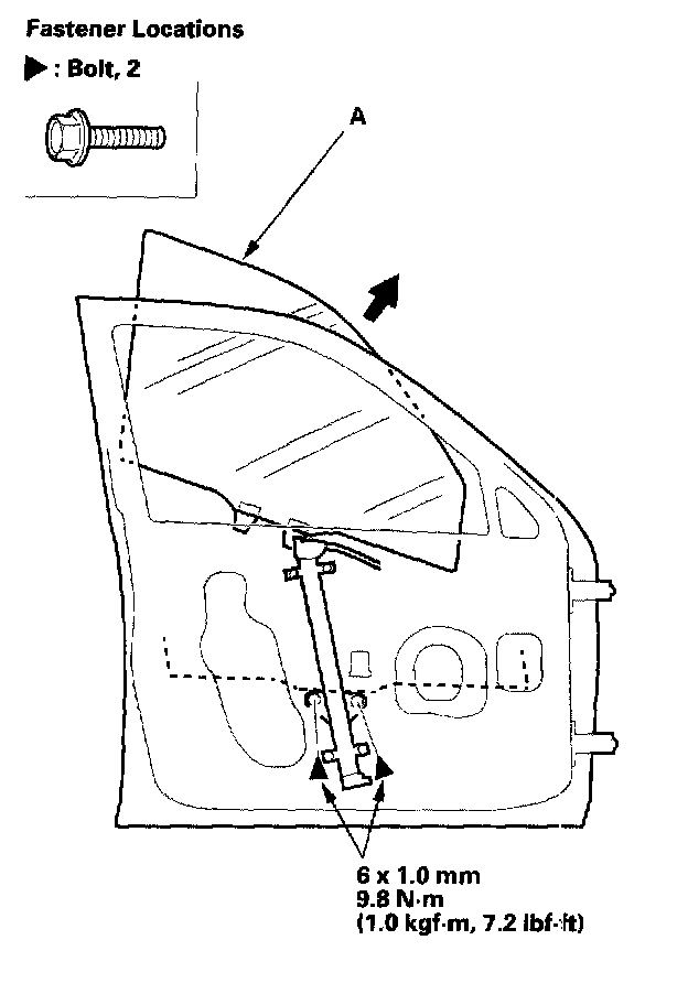 2. Carefully move the glass (A) until you can see the bolts, then remove them. Carefully pull the glass out through the window slot. Take care not to drop the glass inside the door.