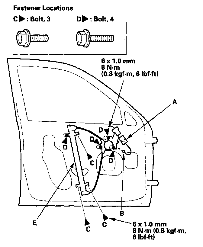4. Remove the bolts (C), and loosen the bolts (D), then remove the regulator (E) through the hole in the door.