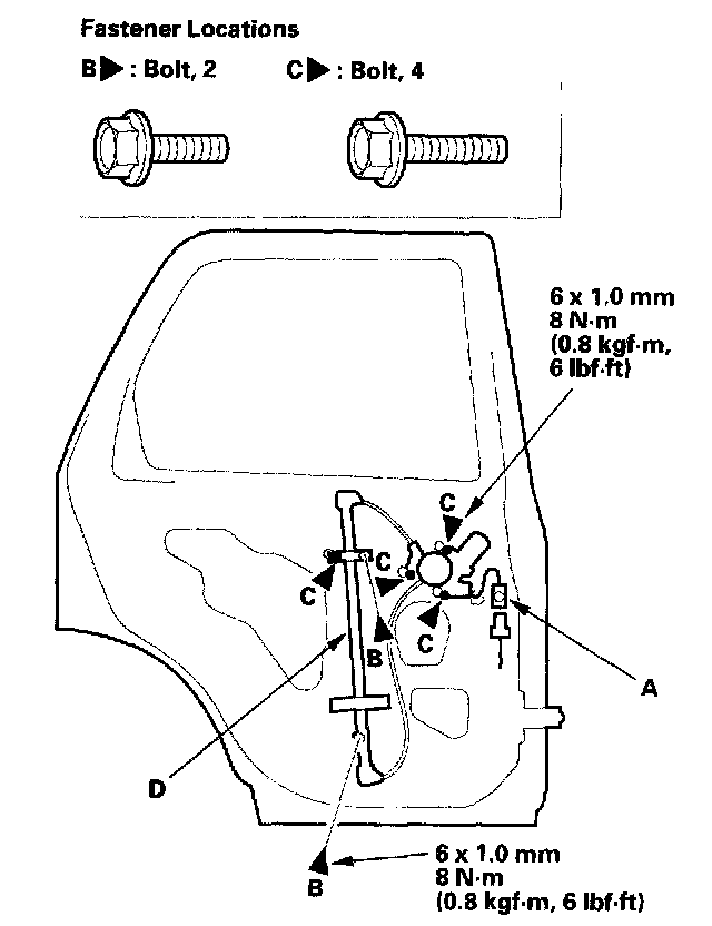 8. Remove the bolts (B), and loosen the bolts (C), then remove the regulator (D) through the hole in the door.