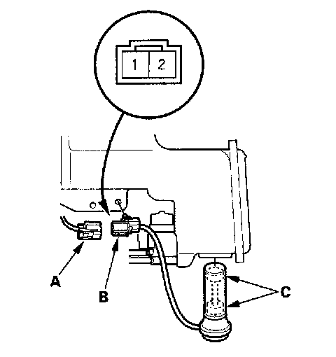 3. Check for continuity between the No.1 and No.2 terminals in each float position (C).