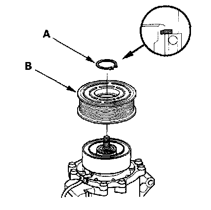 3. If you are replacing the field coil, remove the snap ring (A) with snap ring pliers, then remove the rotor pulley (B). Be careful not to damage the rotor pulley and compressor.