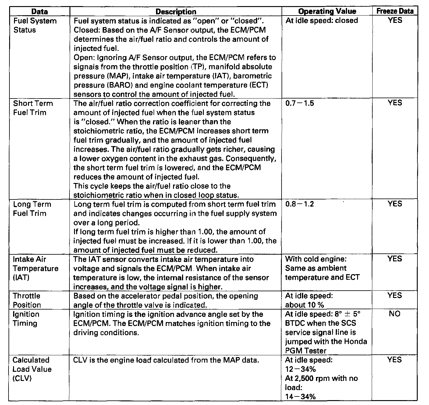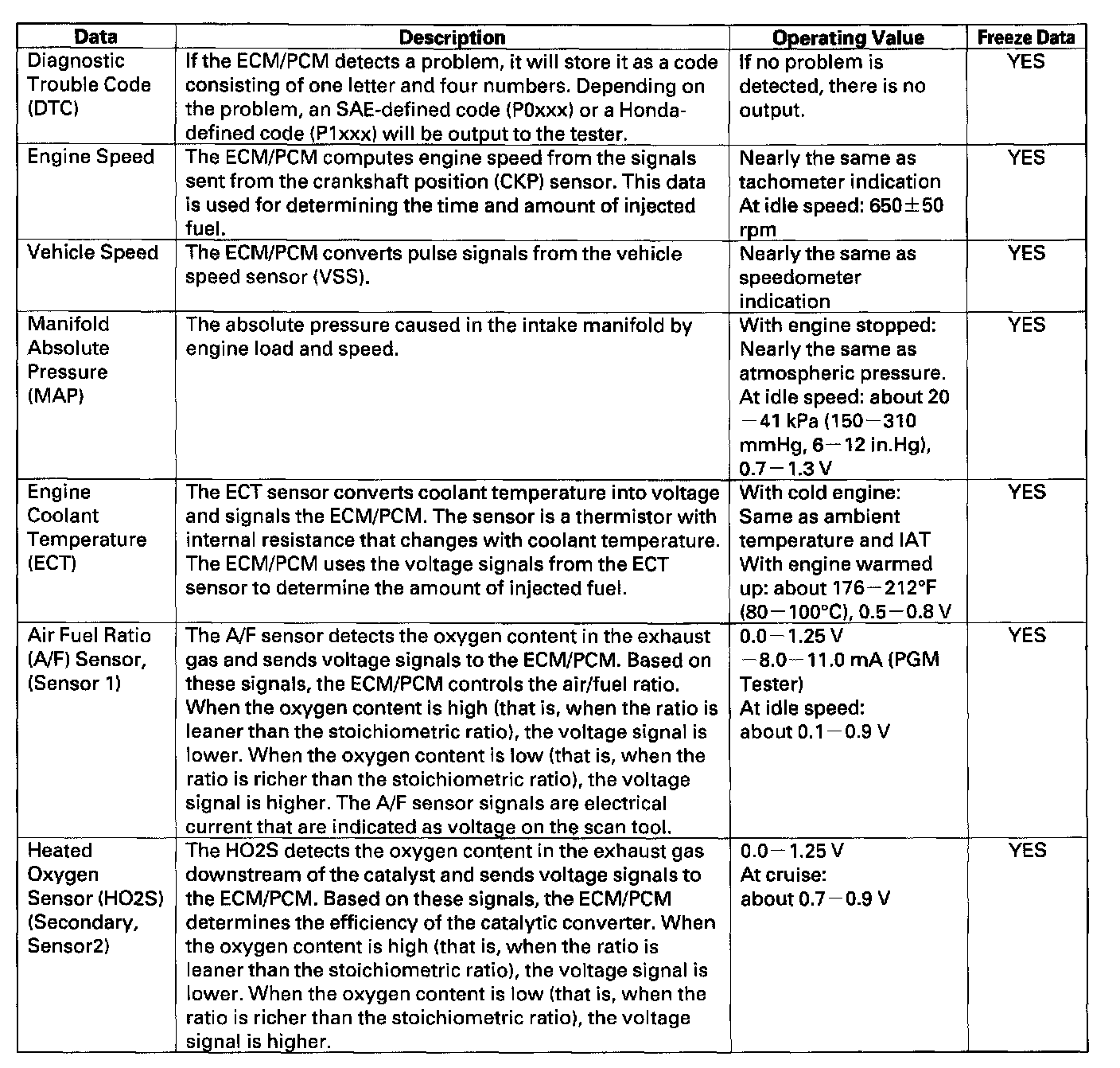 ECM/PCM DataYou can retrieve data from the ECM/PCM by connecting the OBD II scan tool or the Honda PGM Tester to the data link connector (DLC). The items listed in the table above conform to SAE recommended practice. The Honda PGM Tester also reads data beyond that recommended by SAE to help you find the causes of intermittent problems.