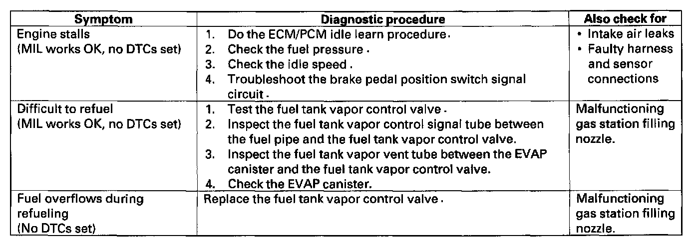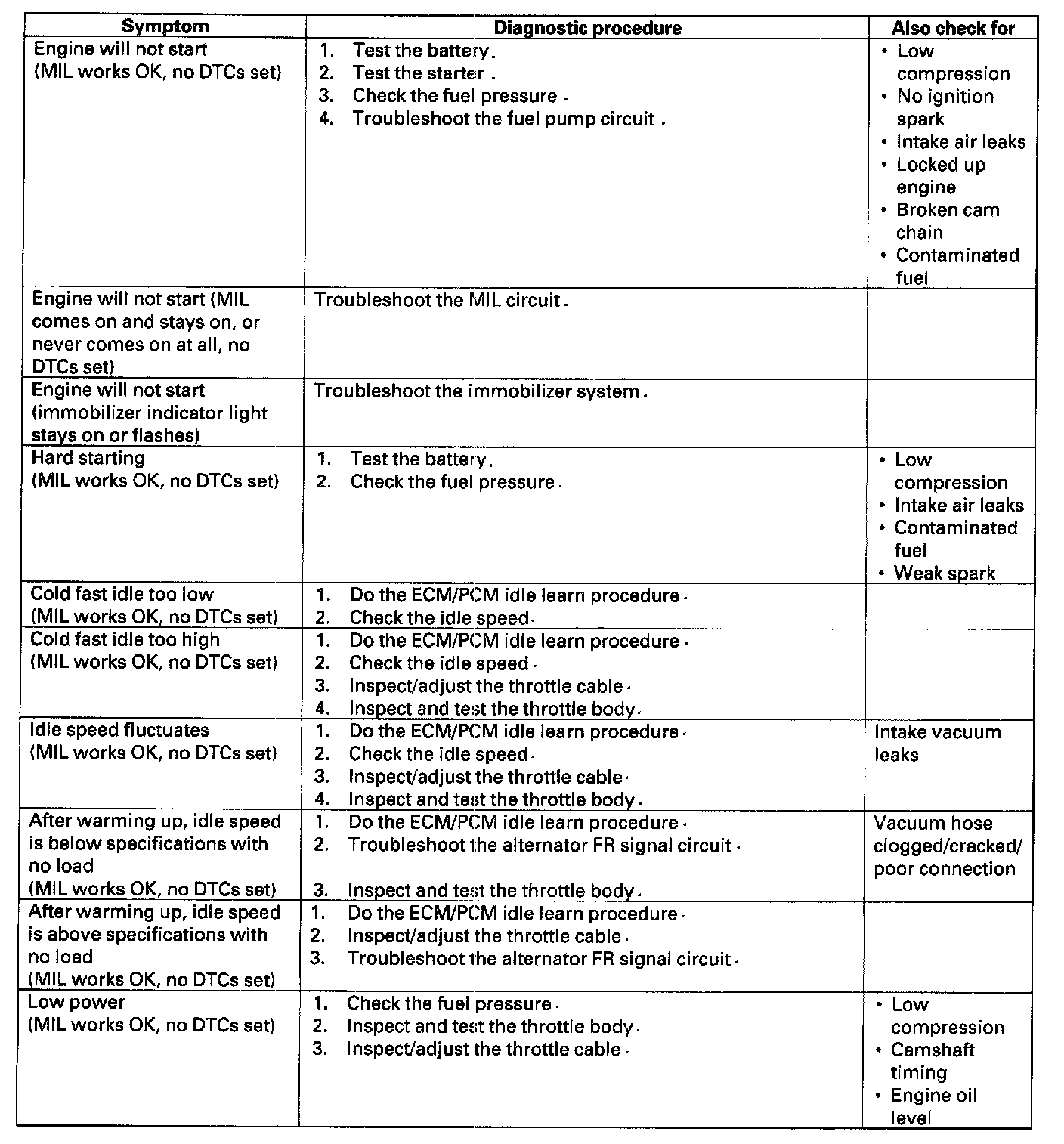 When the vehicle has one of these symptoms, check for a diagnostic trouble code (DTC) with the scan tool. If there is no DTC, do the diagnostic procedure for the symptom, in the sequence listed, until you find the cause.