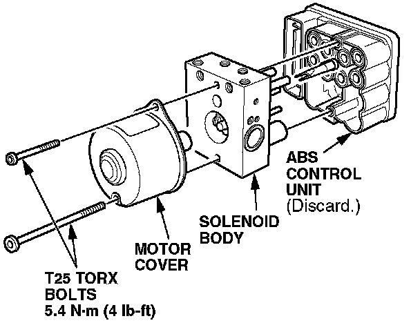 7. Remove the two T25 Torx bolts from the motor cover, and remove the solenoid body. Discard the old ABS control unit.