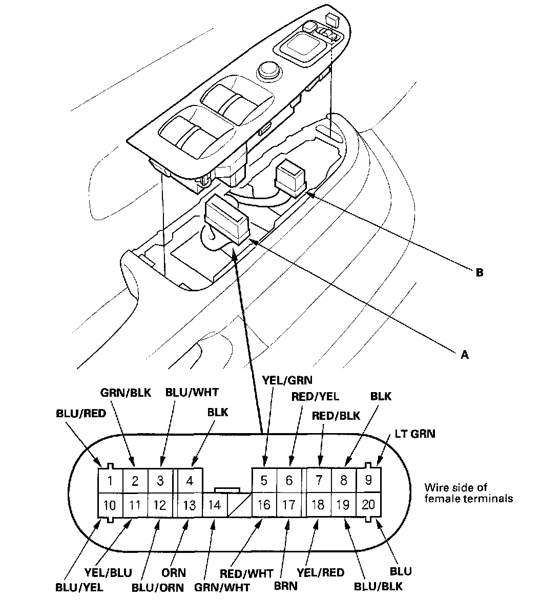 2. Disconnect the 20P connector (A) from the master switch (B).