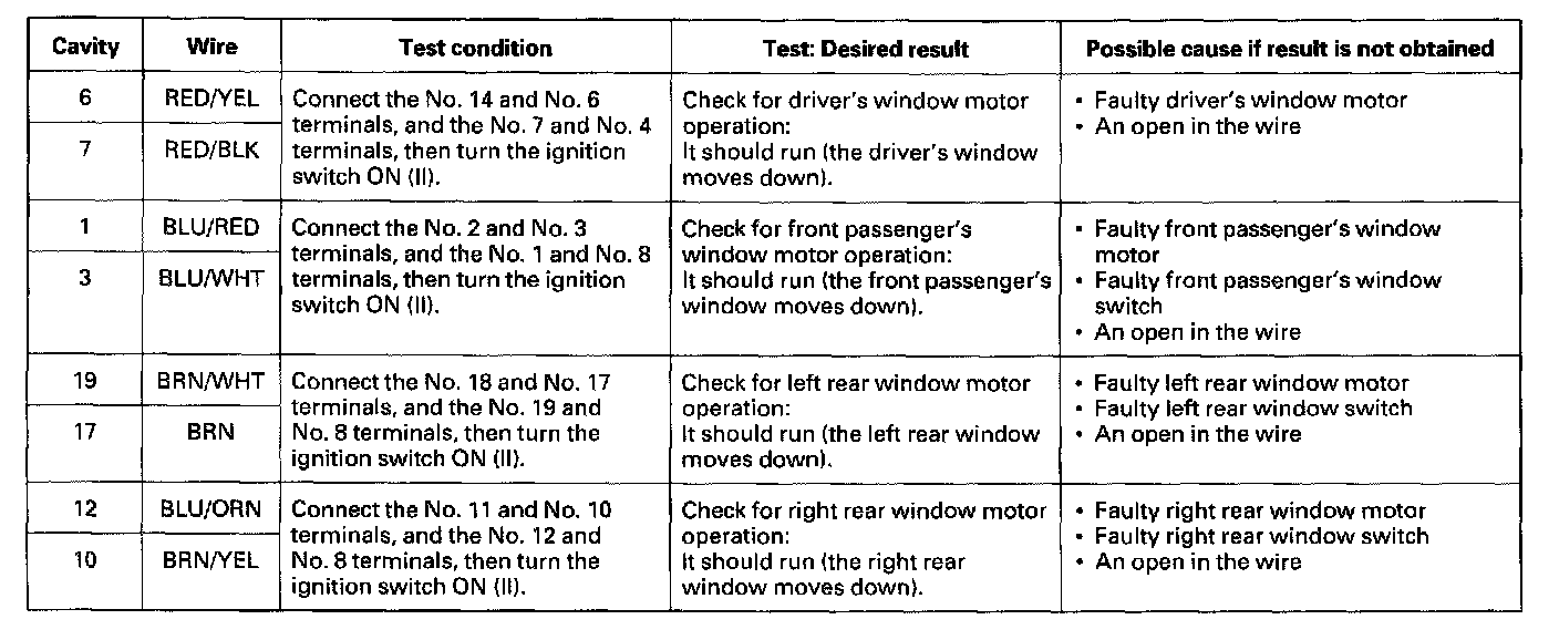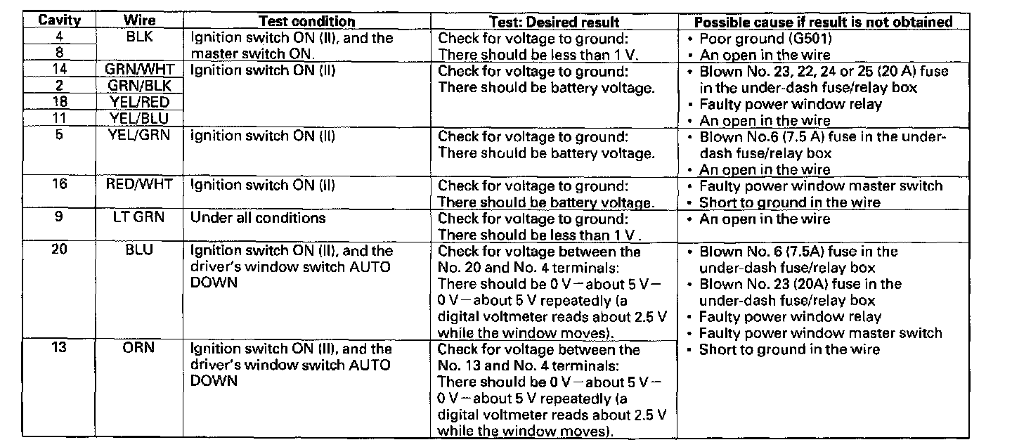Master Switch Input TestNOTE: The power window control unit is built into the power window master switch, and it only controls the driver's window operations.