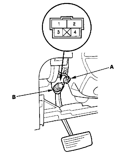 Brake Pedal Position Switch Test1. Disconnect the 4P connector (A) from the brake pedal position switch (B).