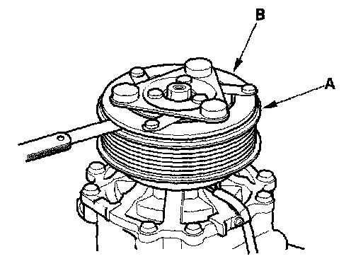 3. Measure the clearance between the rotor pulley (A) and the armature plate (B) all the way around. If the clearance is not within specified limits, remove the armature plate and add or remove shims as needed to increase or decrease clearance.